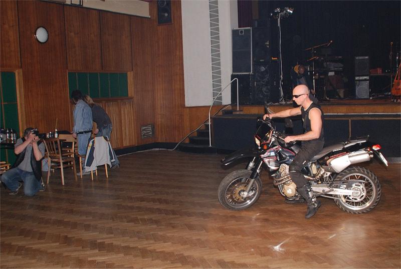 | Co se děje? Na parket se s mírným zpožděním (zaviněným drobným technickým problémem) vřítil neznámý pilot na krásné Husqvarně. Jelikož je dobře maskován černými brýlemi, těžko říci, o koho se jedná. Fotografové žhaví své aparáty. |